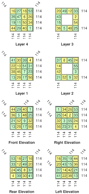 | Plans and elevations of a Magic Box Cube of order 3 - Version 1/4 |